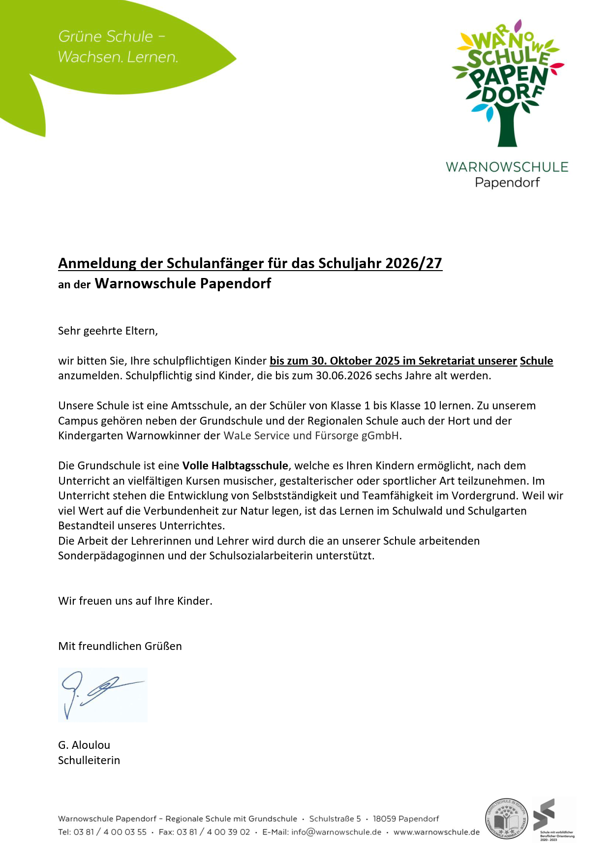 Anmeldung der Schulanfänger für das Schuljahr 2026/27 an der Warnowschule Papendorf