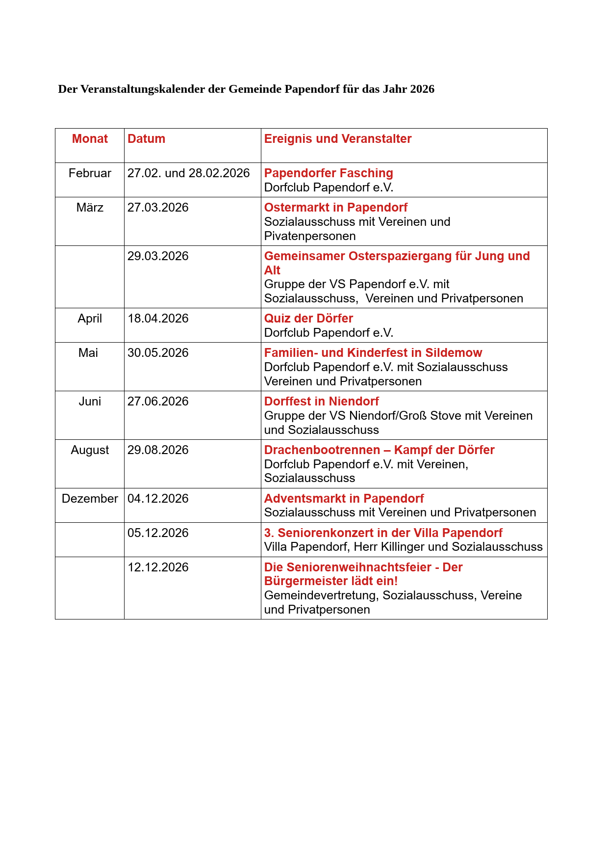 Wie sicher bekannt, schreiben die beiden Vereine der Gruppe der Volkssolidarität in Papendorf und in Niendorf/Groß Stove ebenfalls ihre Jahrespläne und stellen diese auf unserer Internetseite ein. Bei Interesse zur Teilnahme können Sie gern den Sozialausschuss anschreiben. Ihre Anfragen werden weitergeleitet.“