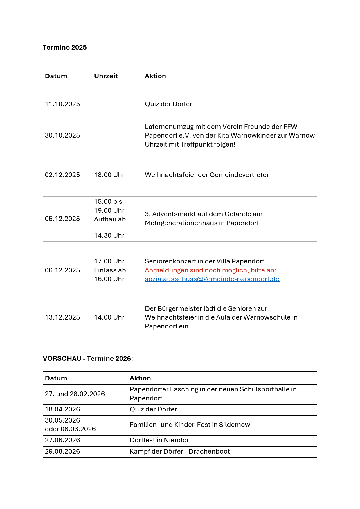 /in Aktuelles, Newsletter/von AdministratorDie öffentlichen/nichtöffentlichen Sitzung der Gemeindevertretung Papendorf findet am Dienstag, 21.10.2025 um 18:30 Uhr im Versammlungsraum der Freiwilligen Feuerwehr